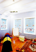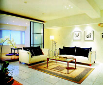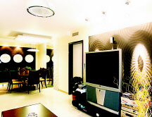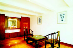 與客廳相連的茶室里用有節(jié)律分布的筒燈來代替室內(nèi)主射燈,從而使規(guī)則排布的條形假梁閃現(xiàn)出幾分靈動的氣息,與棕色木地板、滕椅、方桌相和諧,展示柜的處理極為簡潔,在櫻桃木的映襯下,幾盞精巧的內(nèi)置燈將主人的愛物和盤托出,平和、大度和休閑的氣氛便油然而生。