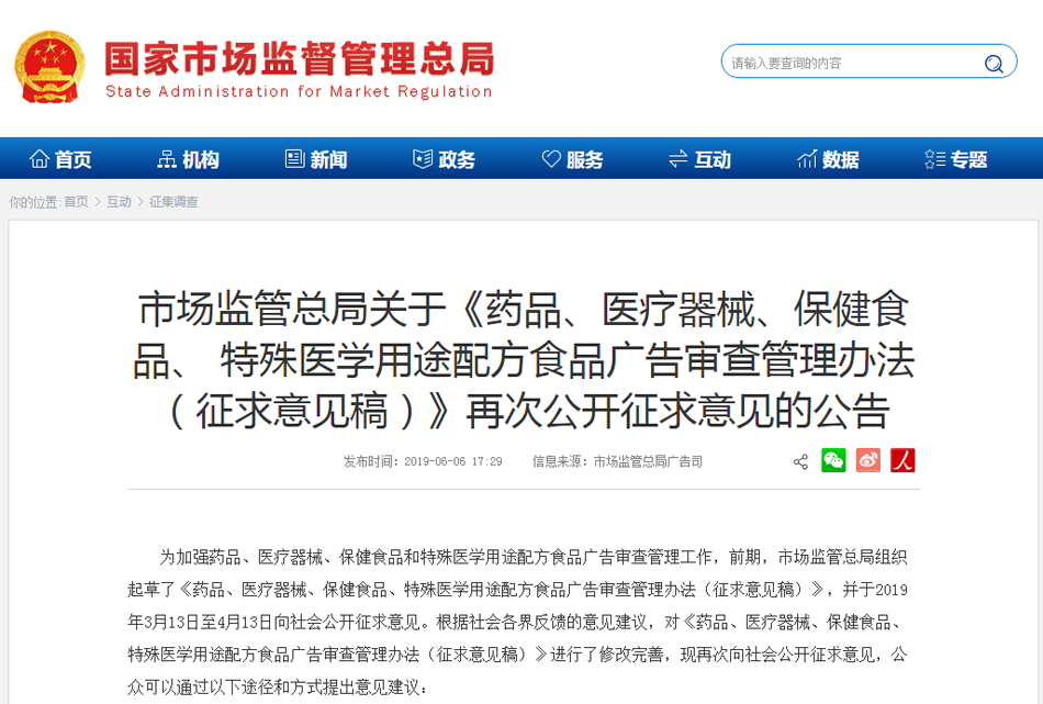 6月6日,國(guó)家市場(chǎng)監(jiān)管總局發(fā)布《藥品、醫(yī)療器械、保健食品、特殊醫(yī)學(xué)用途配方食品廣告審查管理辦法(征求意見(jiàn)稿)》(以下簡(jiǎn)稱征求意見(jiàn)稿),這是今年3月13日以來(lái),國(guó)家市場(chǎng)監(jiān)管總局就該管理辦法第二次公開(kāi)征求意見(jiàn)。