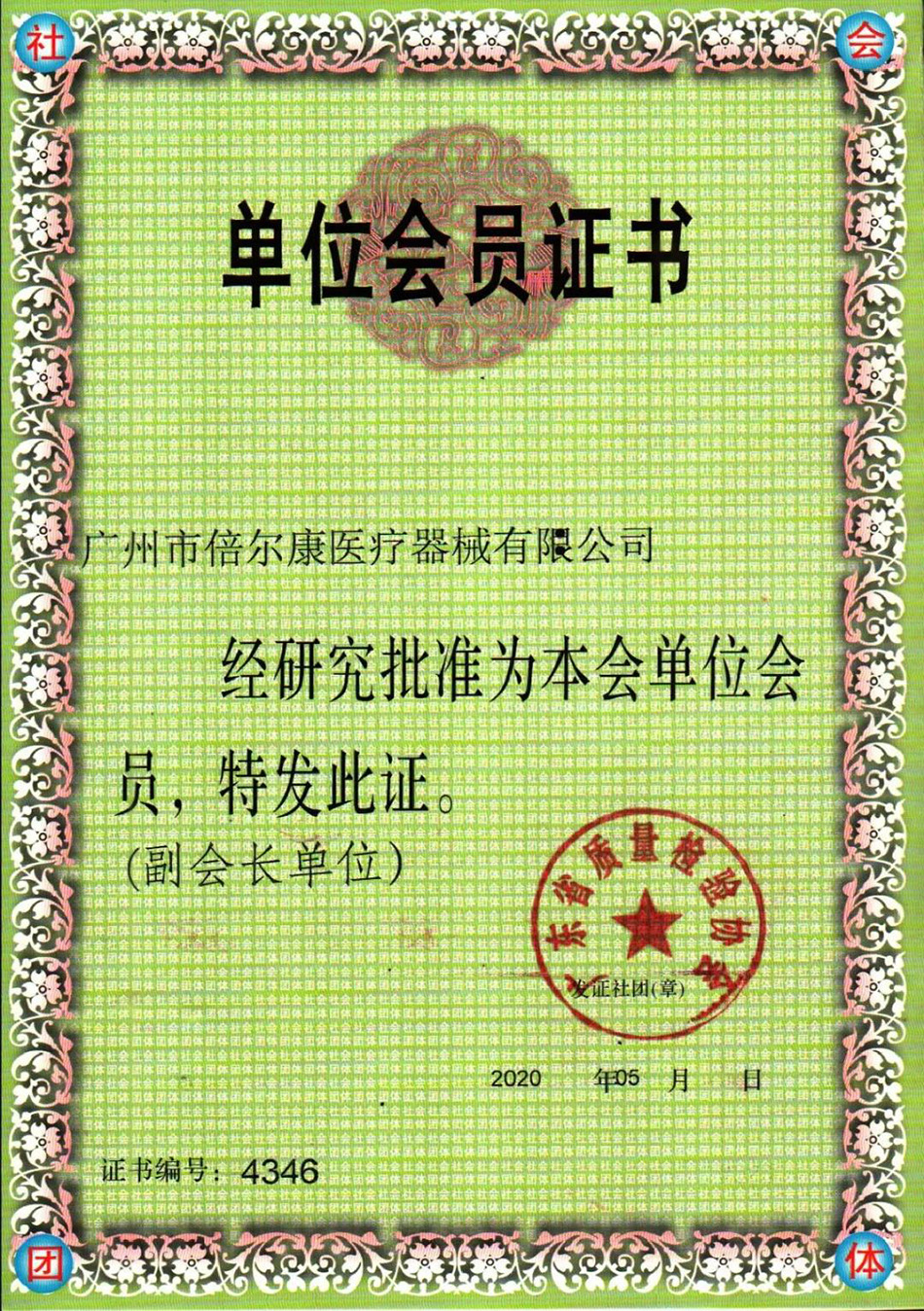 廣州市倍爾康醫(yī)療器械有限公司當(dāng)選“廣東省質(zhì)量檢驗(yàn)協(xié)會(huì)副會(huì)長(zhǎng)單位”。