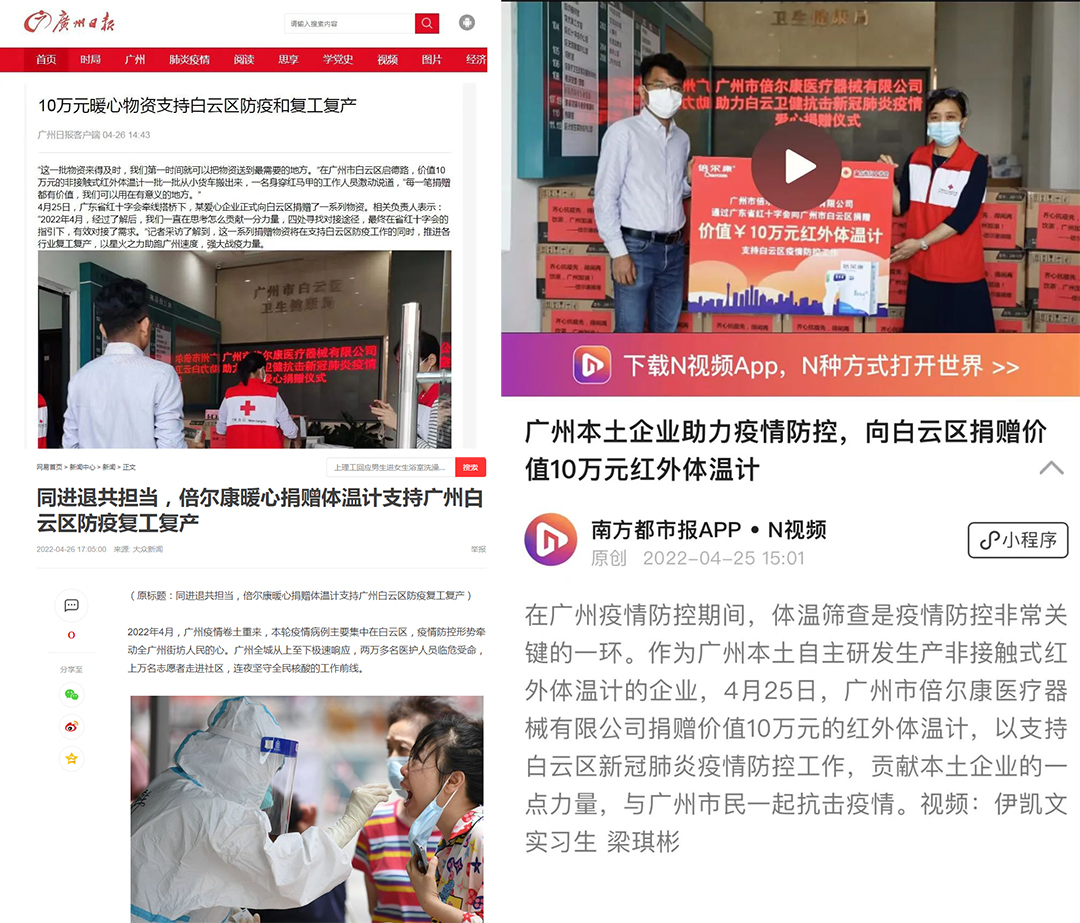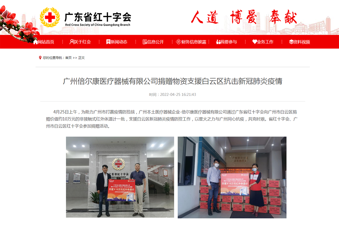 廣東省紅十字會也在其官網(wǎng)報(bào)道了倍爾康捐贈體溫計(jì)的消息,并感謝倍爾康的愛心捐贈以及高度肯定了倍爾康的社會責(zé)任感。